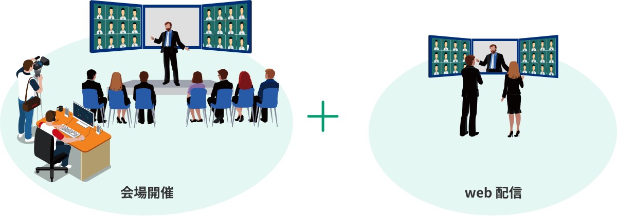 「会場開催」と「web配信」を組み合わせたハイブリッドセミナーで効果的かつ効率的なセミナーができます。